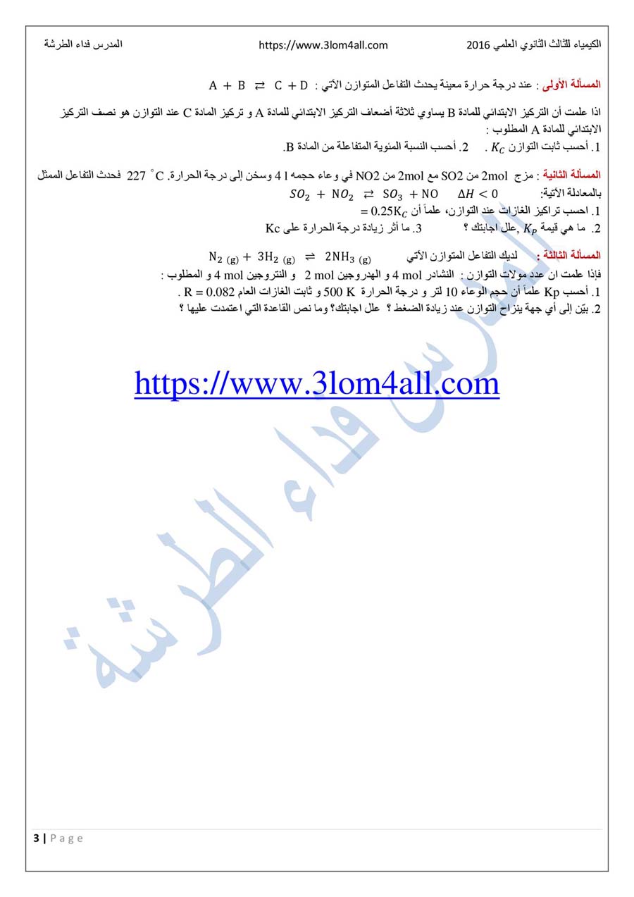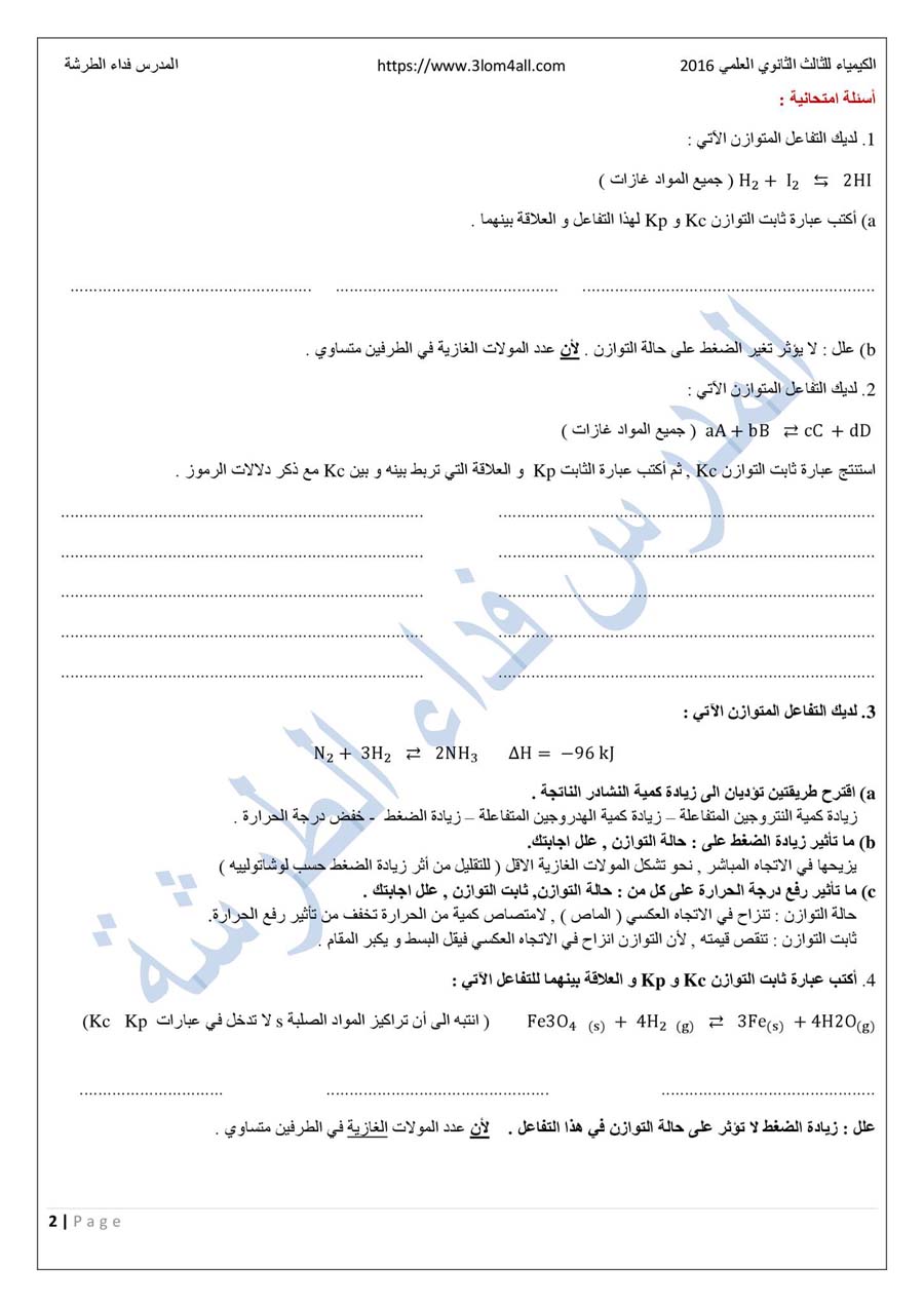 الكيمياء للثالث الثانوي العلمي ملخص التوازن الكيميائي عبارة عن 3 ورقات فقط