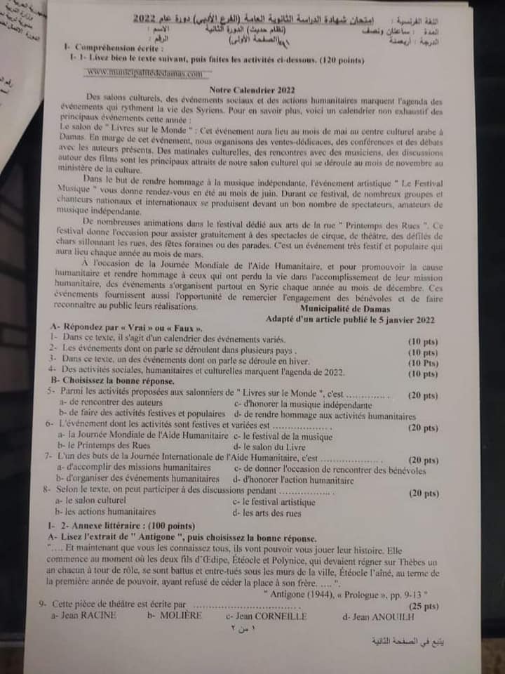 بكالوريا فرنسي 2022 دورة ثانية العلمي والادبي أسئلة امتحان شهادة الثانوية العامة الفرع العلمي والادبي في مادة اللغة الفرنسية (نظام حديث) للدورة الثانية التكميلية عام 2022 بكالوريا دورة ثانية الحل لاحقا