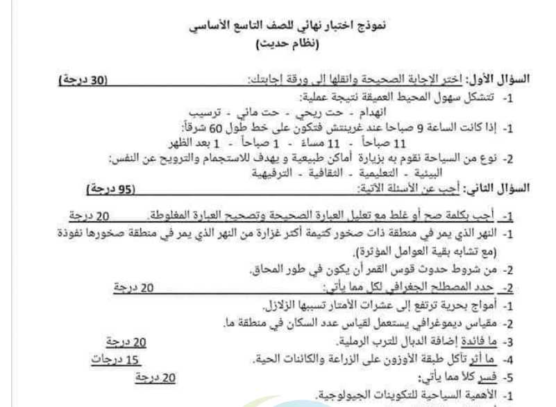 نموذج جغرافيا للامتحان النهائي للصف التاسع مع سلم التصحيح